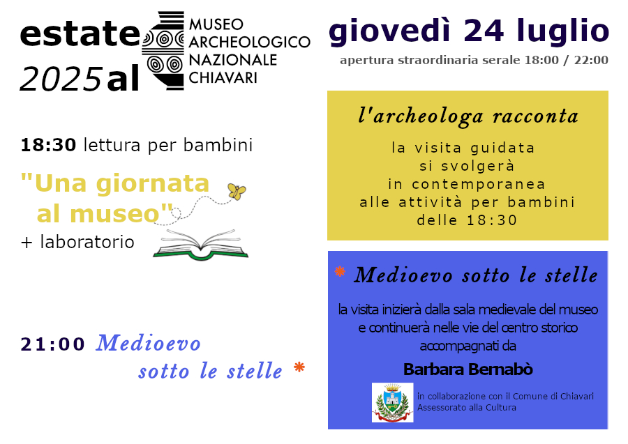 Alle 21:30 ritorna il richiesto appuntamento con Barbara Bernabò che ci racconterà il Medioevo a Chiavari, dentro e fuori il museo. Per questo evento ringraziamo l'Assessorato alla Cultura del Comune di Chiavari per la collaborazione.